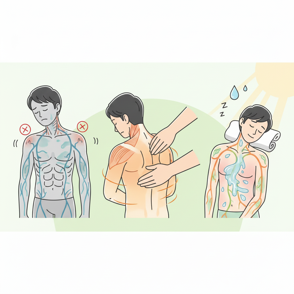 水分が足りないと、流れ出した老廃物がまた体にとどまってしまい、「もみ返し」や「だるさ」の原因になることがあります。