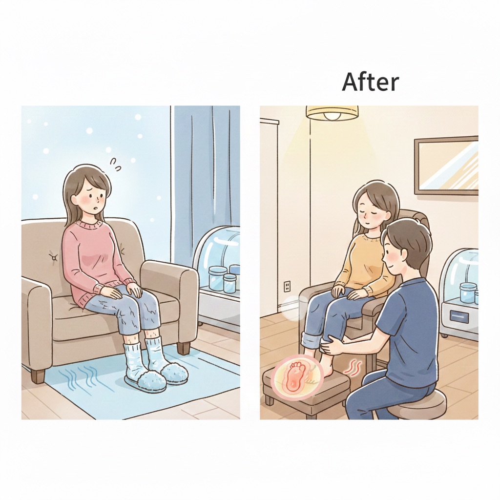 今回は、なぜ冬にこれほど足が辛くなるのか?その原因と、strong>「足つぼ(フットケア)」による根本改善策について、分かりやすくお話しします。