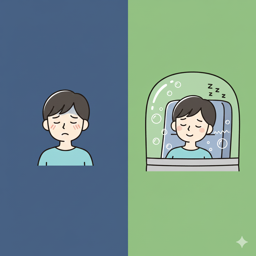酸素カプセルでリラックス状態(副交感神経が優位な状態)を作ってから帰宅すると、家に帰ってからの入眠がとてもスムーズになります。